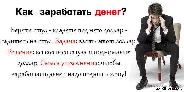 | Как заработать денег? Берёте высокий стул, кладёте ему под ножку 20 гривен, садитесь на стул. Задача: взять эти 20 гривен. Решение: встаёте со стула, наклоняетесь и поднимаете деньги. Смысл упражнения: чтобы заработать денег, надо поднять задницу! Прикрепления: Картинка 1 |